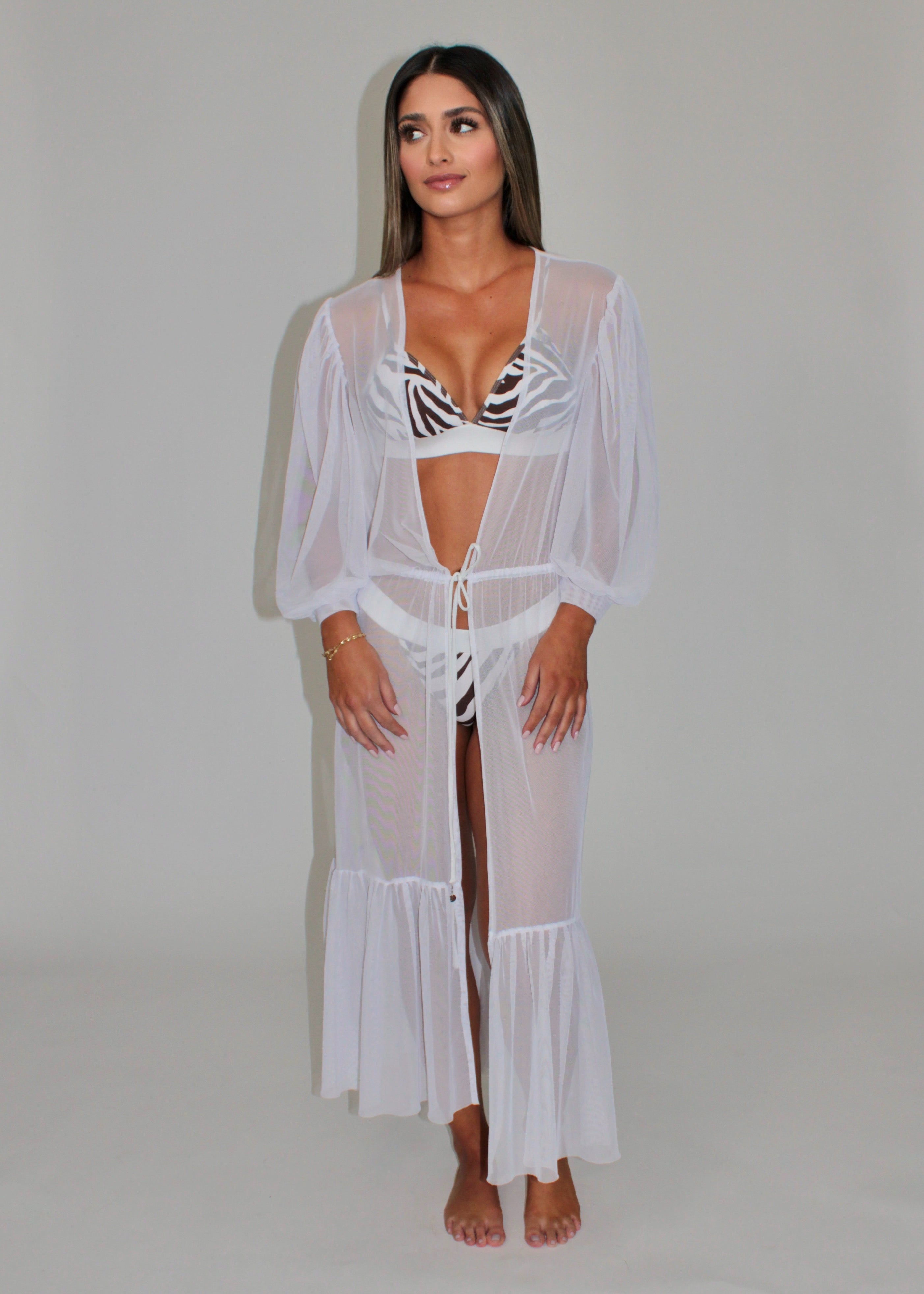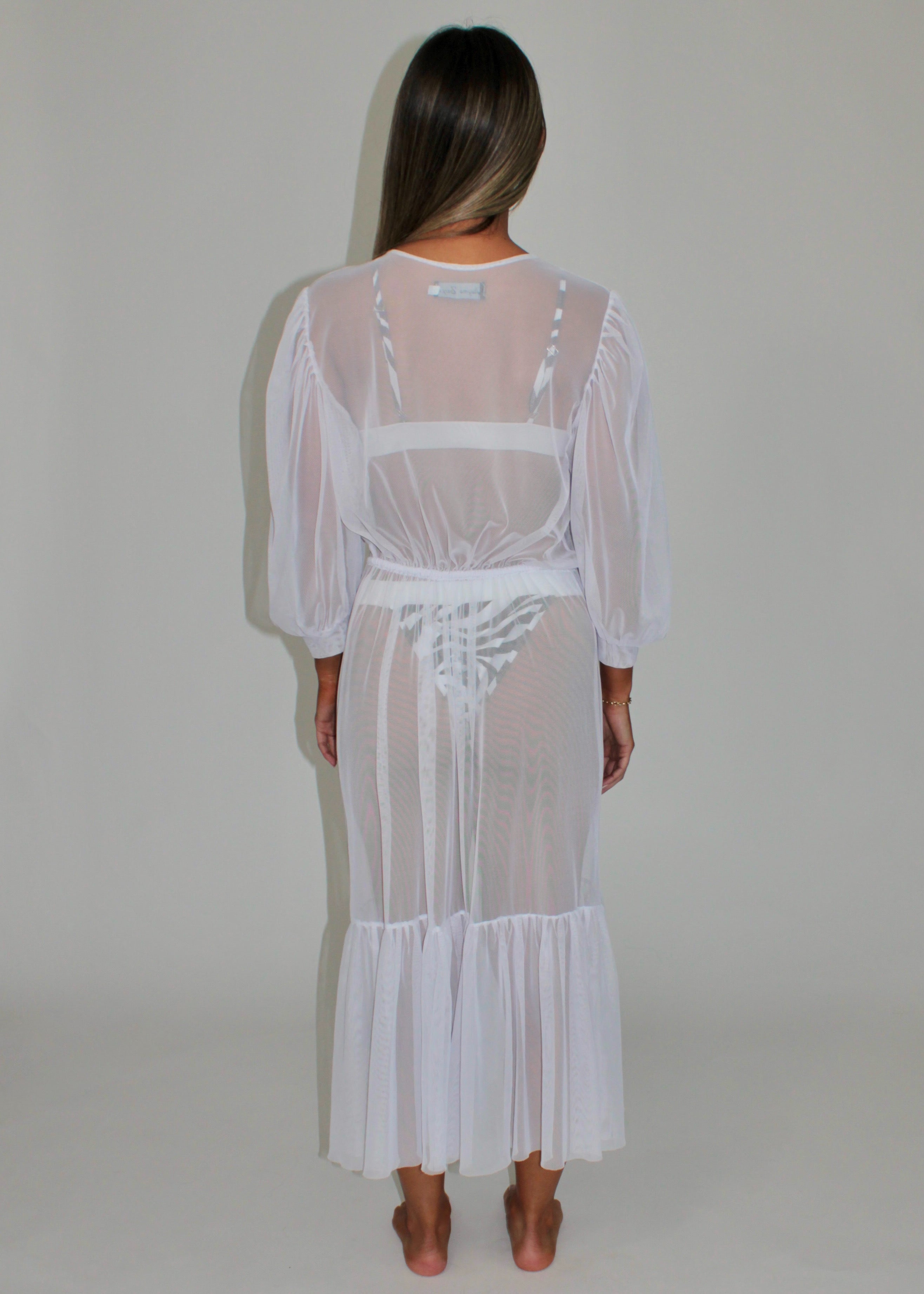 Long, sheer white cover-up dress. It is designed to be worn over swimwear.