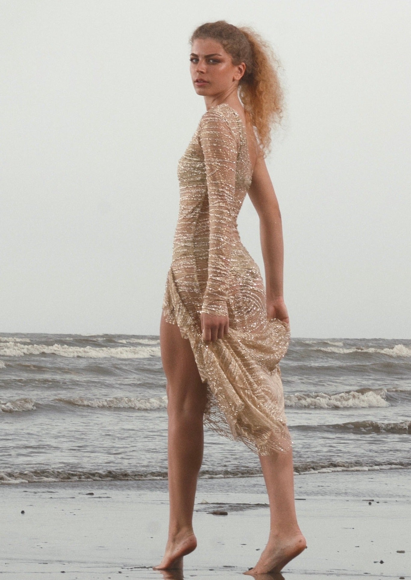 Introducing our exquisite Asymmetrical One-Shoulder Dress, a dazzling masterpiece meticulously crafted by hand to embody luxury and sophistication. This dress is adorned with sequins, glitter, and hints of gold, ensuring you sparkle and shine with every step.